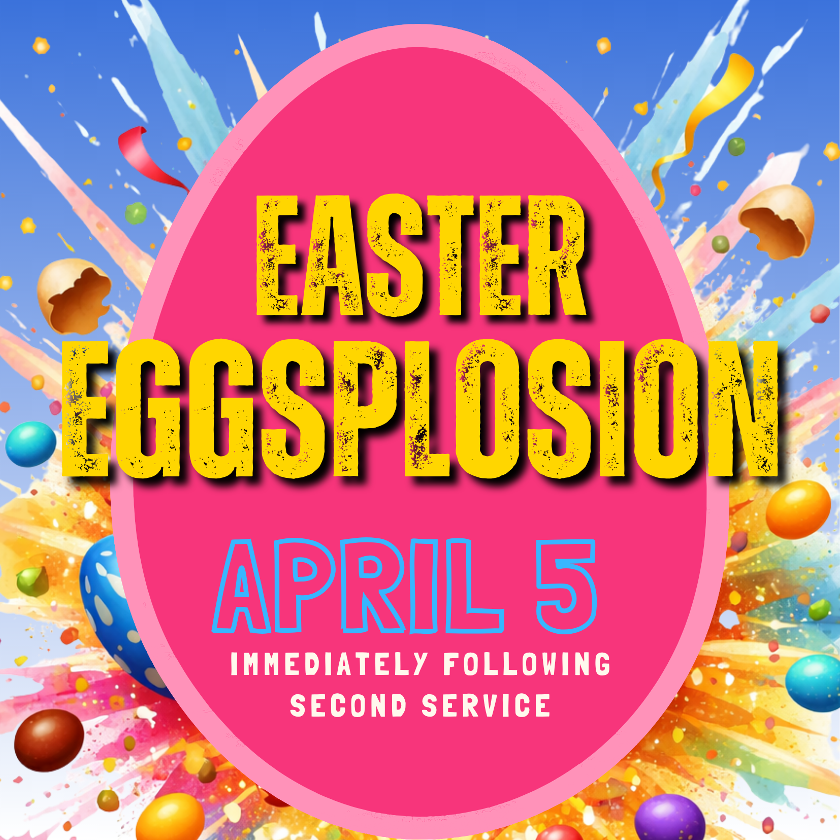Join us this Easter Sunday after our 11am service, for a fun Easter Eggsplosion event for kids from 2-12 years old!